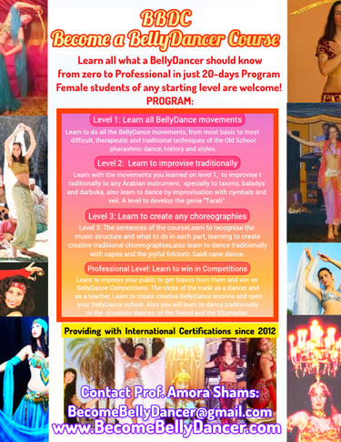 Prof. Amora Shams is a Master Teacher, who has been teaching BellyDance since 1993 in a very exceptional and intensive way, she developed a teaching methodology which makes her students, no matter their starting level, to achieve the difficult movements in the first 15 teaching hours of the formation course taught face to face as a private student, that's why she is the only one who can create BellyDancers performer, teachers & choreographers in just 20 days Course!