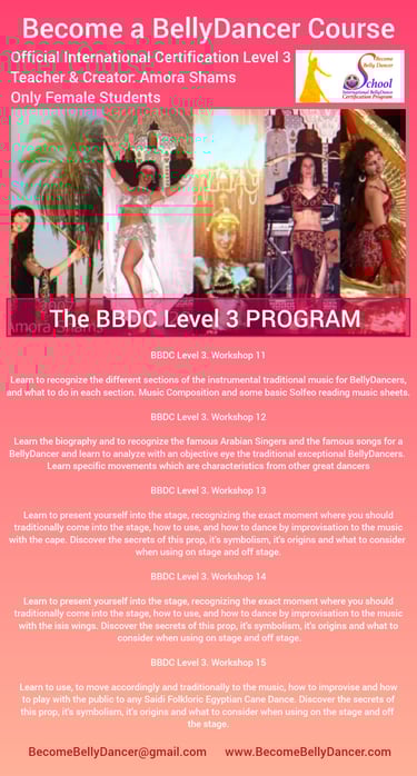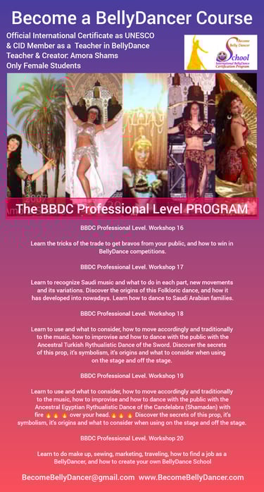 Prof. Amora Shams is a Master Teacher, who has been teaching BellyDance since 1993 in a very exceptional and intensive way, she developed a teaching methodology which makes her students, no matter their starting level, to achieve the difficult moves in the first 15 teaching hours of the formation course taught face to face as a private student, that's why she is the only one who can create BellyDancers performer, teachers & choreographers in just 20 days!