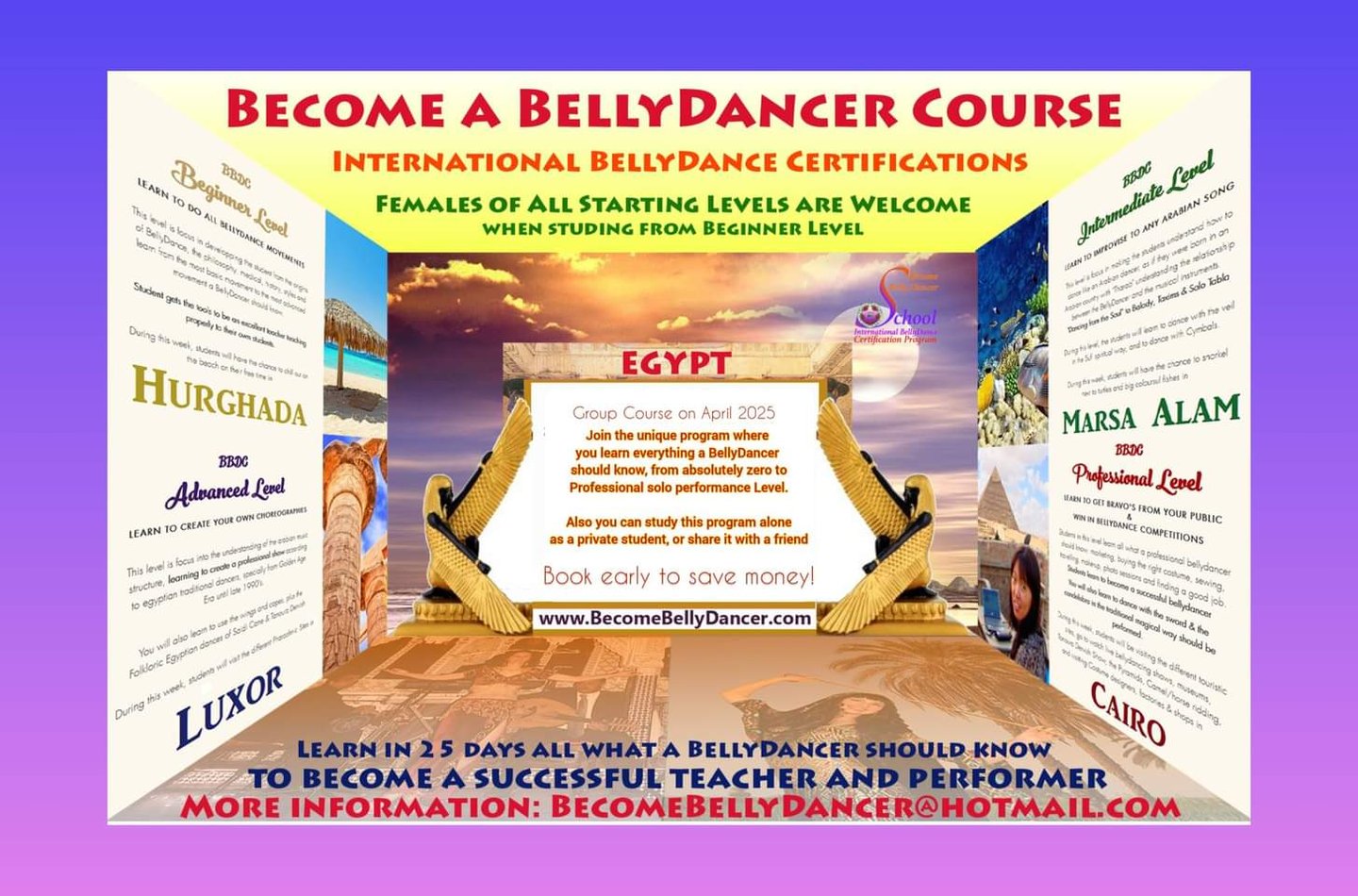 The BBDC "Become a Bellydancer Course" program is made up of 4 levels, where students have to study with a notebook in hand, taking notes during class and with daily duties to present to the teacher to be Also corrected daily by her, and if there are errors, do them again but correctly by the student. When you study in person in 20 intensive days, each level is made up of 5 lessons of 3 hours each, and at the end of each level, the student is examined with a written and practical exam. The BBDC is a unique and unrepeatable course. Take the opportunity to study from a unique teacher in her traditional and captivating style. She is probably one of the few in the world to share the secrets of the oriental dance, commonly called "belly dance".