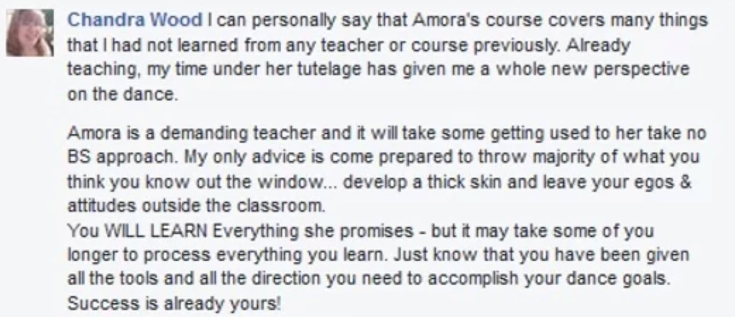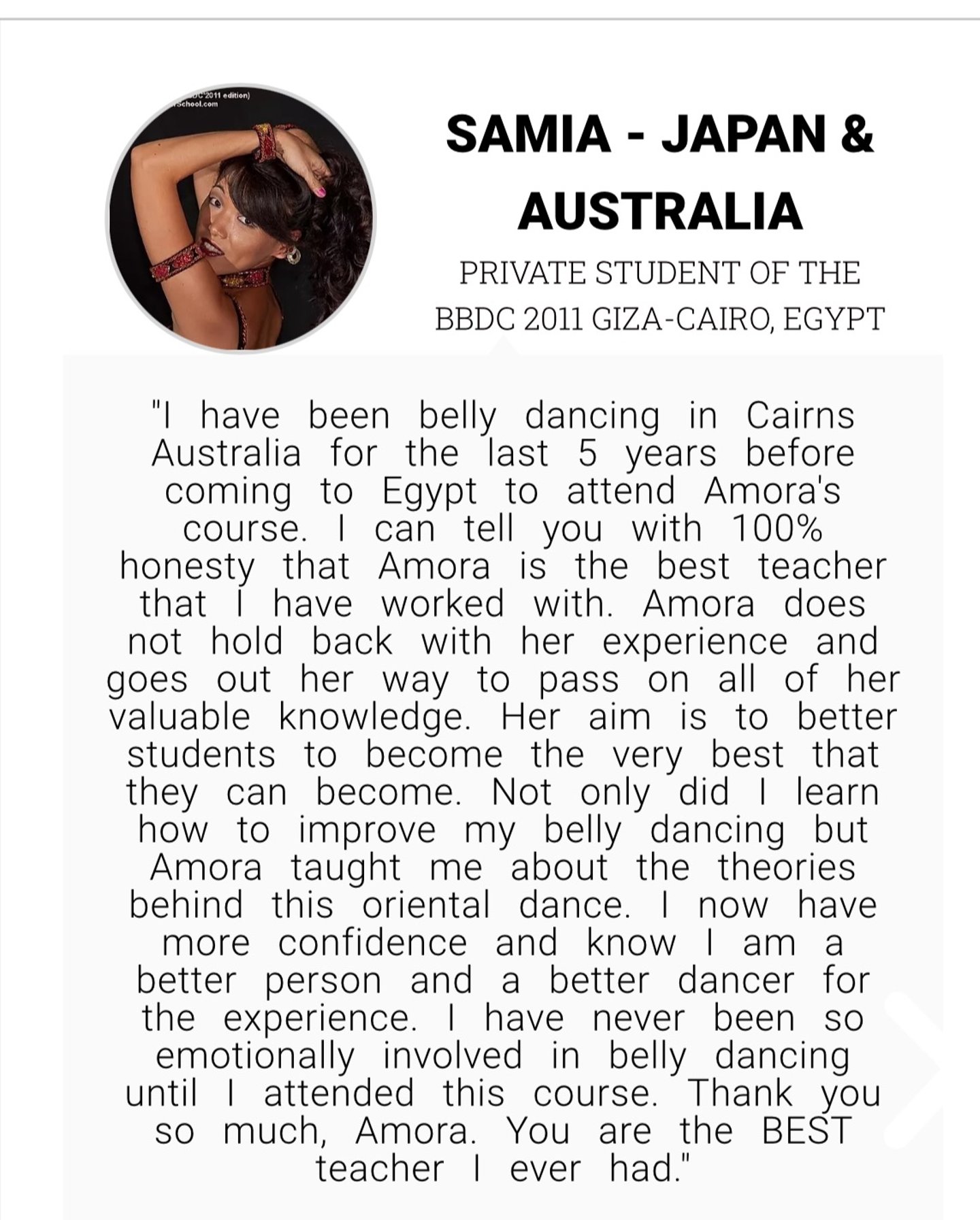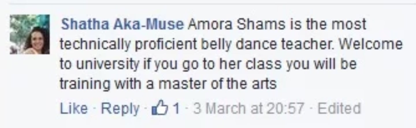 Since 1994 until 2008 Amora Shams was developing the teaching techniques and course structure of Alia Shams, specially from 2002 until 2008 while teaching in London, Barcelona, Almuñécar & Cairo, to a point that on year 2008 while living in Egypt, any female student who followed her teachings, plus doing the daily written and practical homework, could achieve in just 20 days a professional level no matter their starting level.
