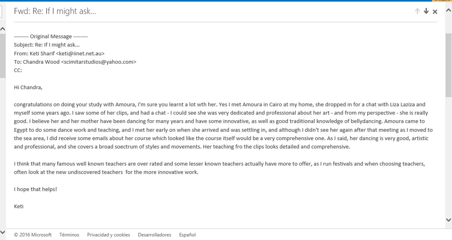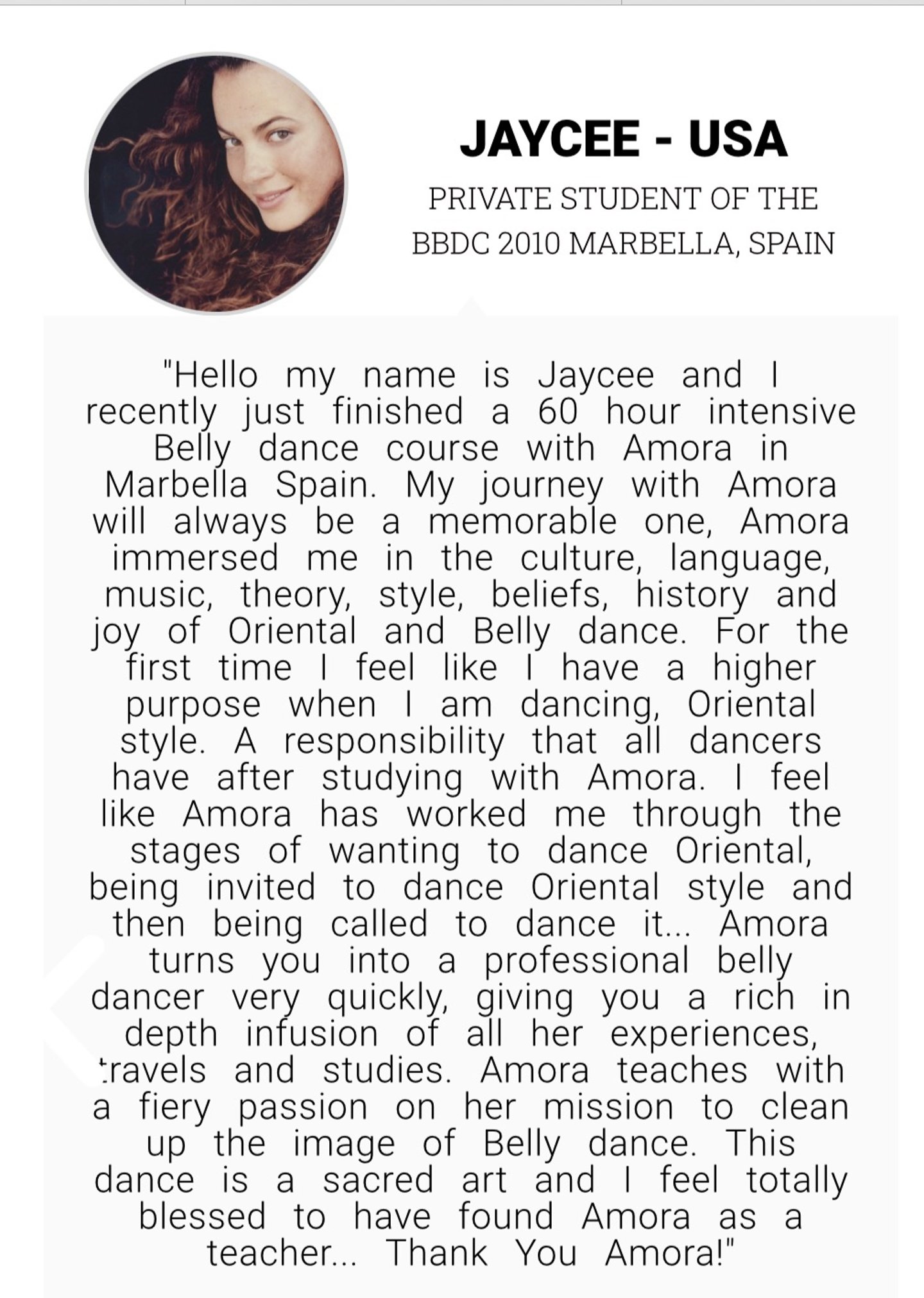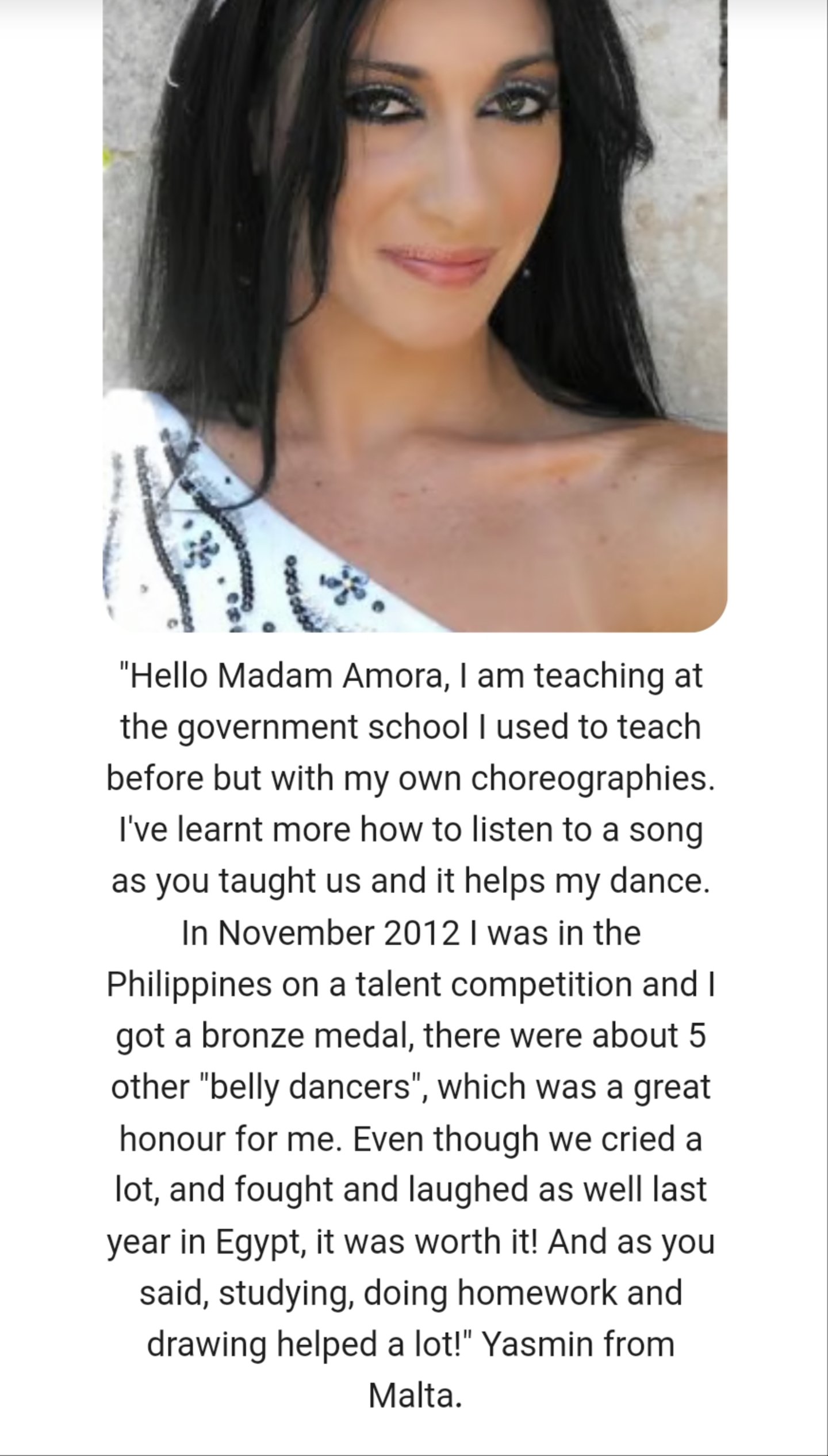 Then the UNESCO Dance Department is when contacted Amora on 2011, to let her know that the only official & international dance certificates can be provided by them, she was asked by them to provide all the evidences of her biography with references of her past as teacher and performer, which she did, and after their evaluation on a meeting they accepted her to become a recognized member as School and Teacher of the International Dance Certification Department providing international BellyDance Levels Certification to her course students on December 2011.