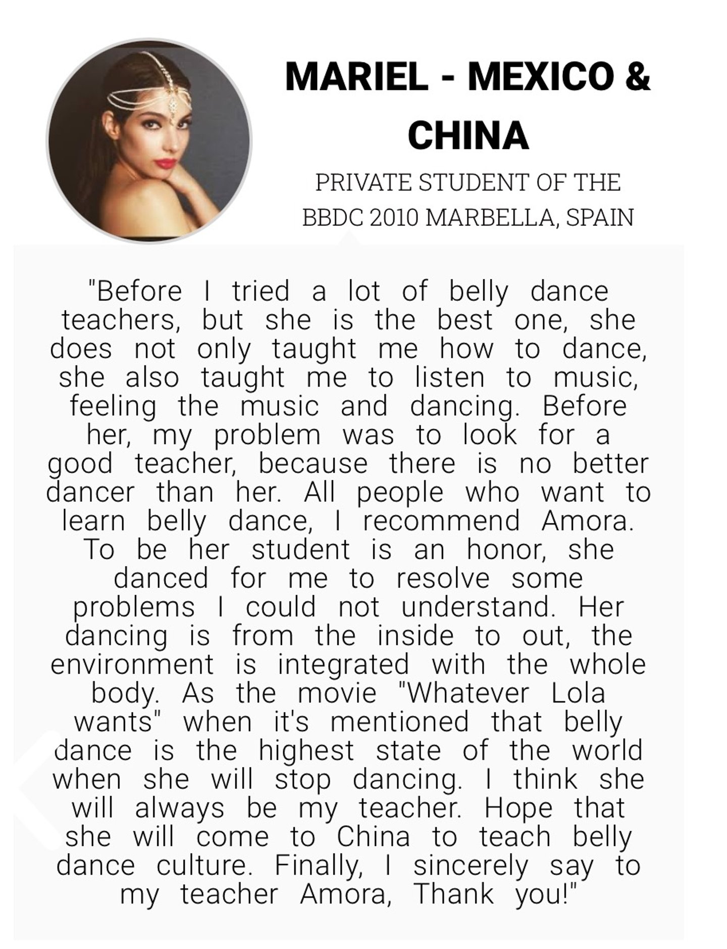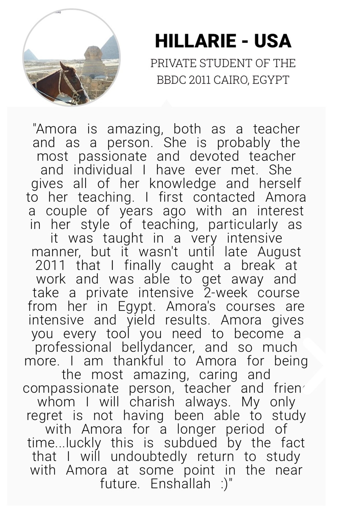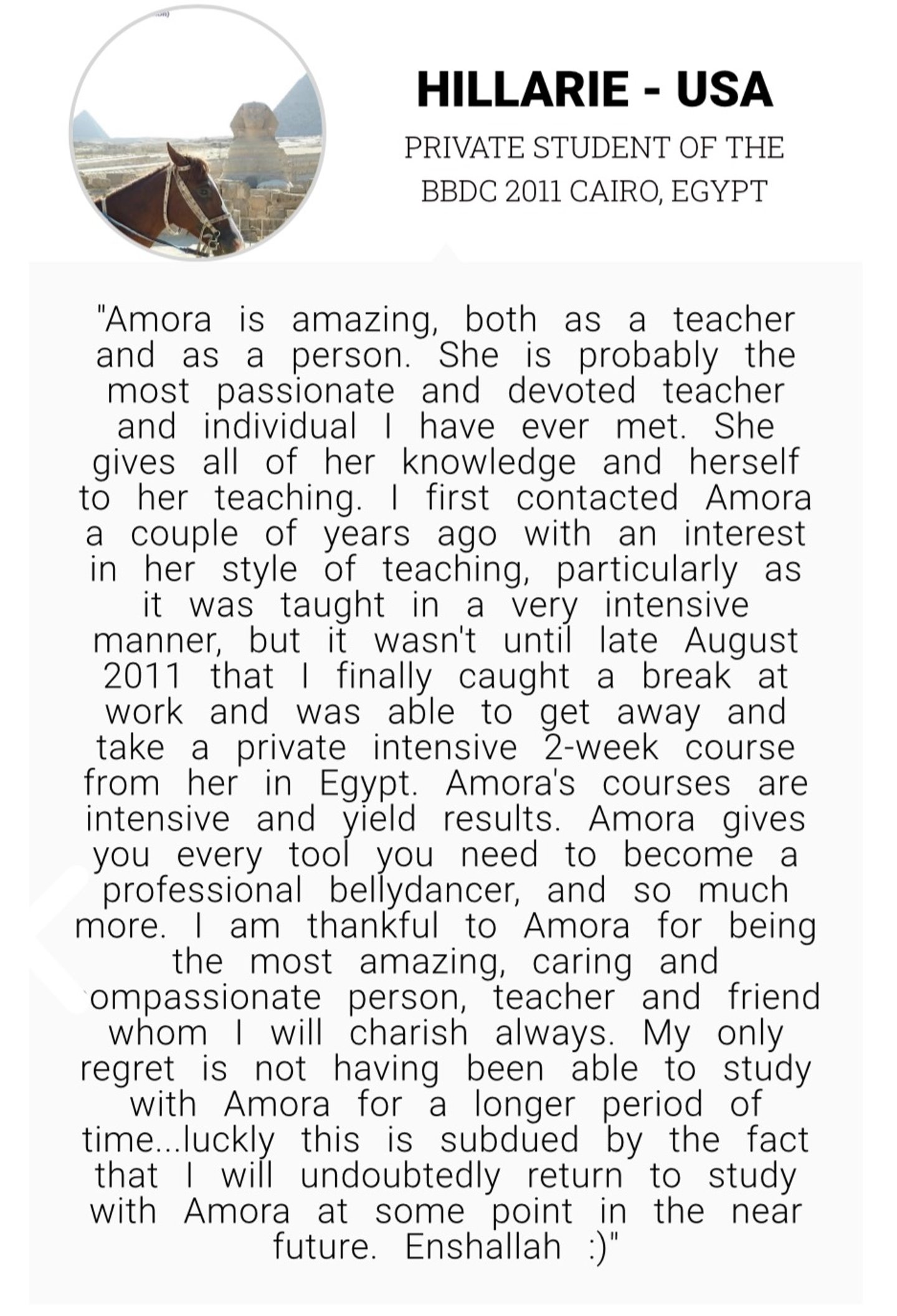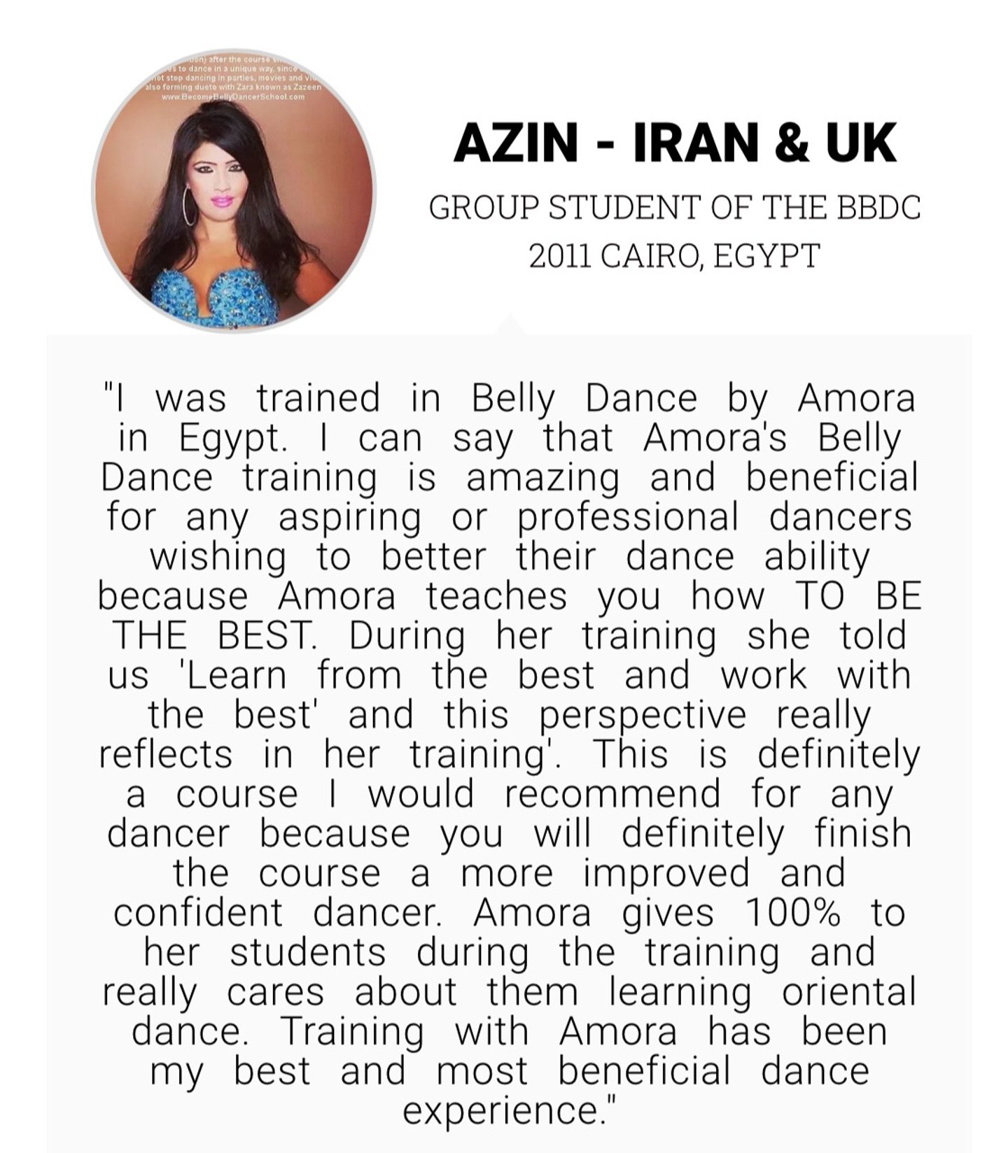 Amora came to Egypt with the purpose of been a performer, after 15 years performing internationally in Europe & Morocco, always been considered everywhere were she danced, one of the best in BellyDance.
