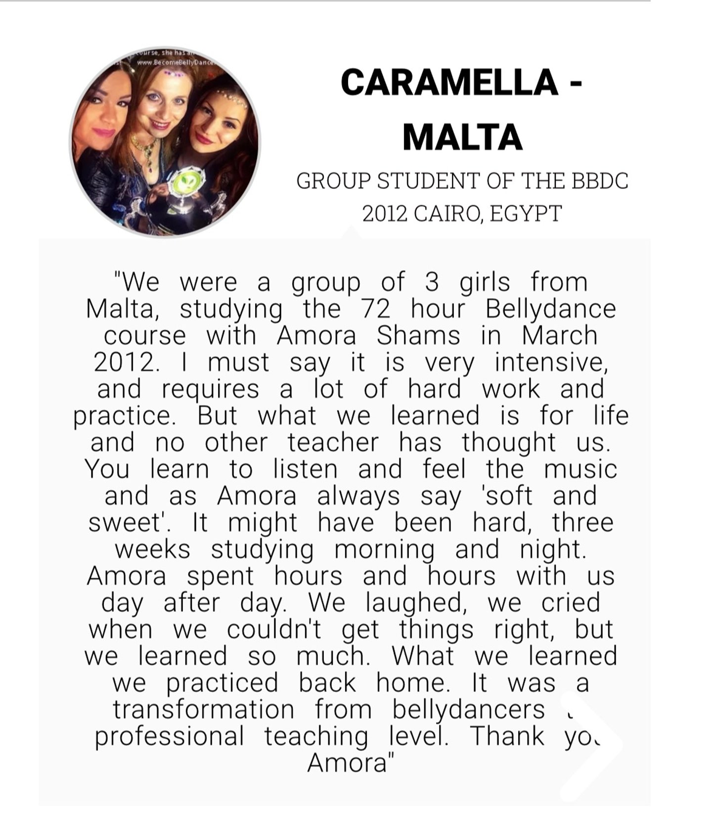 But what she found in Egypt is students asking for certifications, so she decided on 2008, to start giving private level certificates only to those booking her 20 days Course, under her point of view, as a professional BellyDancer at that moment with more than 15 years of experience. At that time the course was known as 60hBDC (60 hours BellyDance Course), on 2010 started to teach also Arabic to her course students expanding 12 hours more to the course then she called 72hBDC (72 hours BellyDance Course), also studied in 20 days.