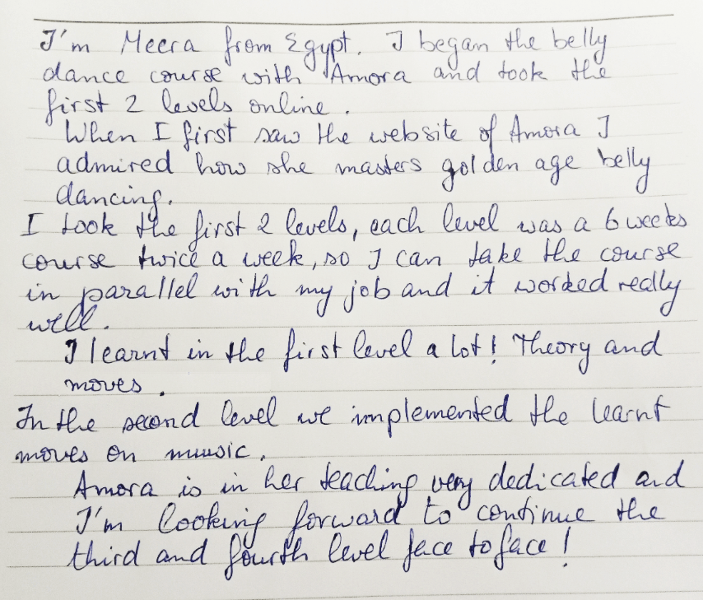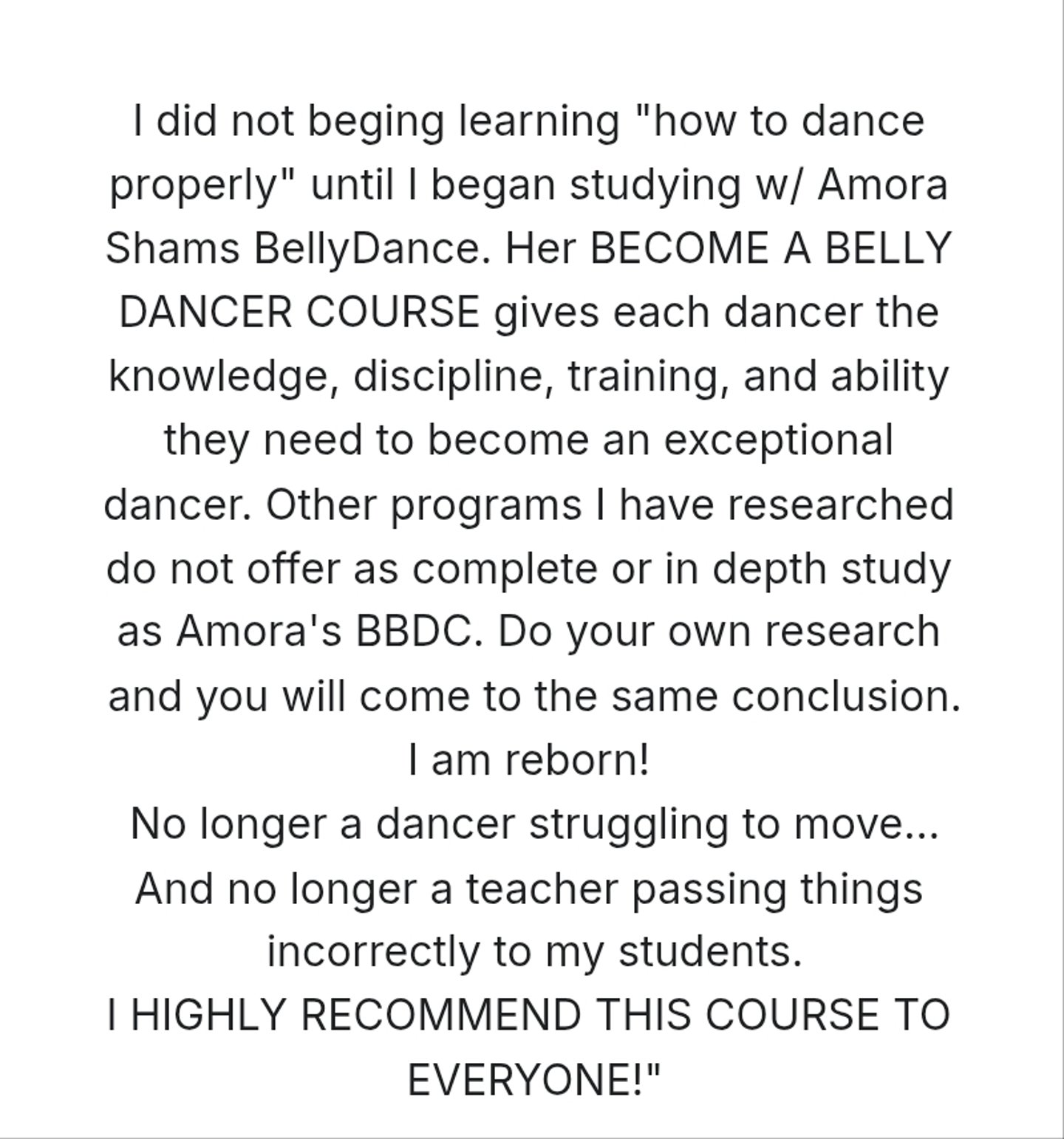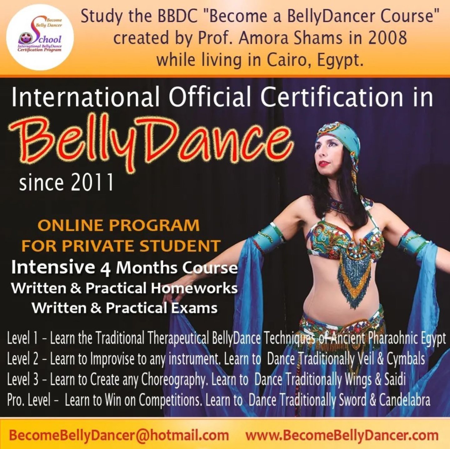 This belly dance course is not a normal course, you do not only learn techniques with combinations or some choreography, it is a course aimed at students of all levels in belly dance, it was exclusively designed to create professional dancers of belly dance intensively teaching them from the most basic to the most complicated, step by step, with exclusive teaching techniques for each private student, who studies it with the teacher of teachers worldwide, Prof. Amora Shams.