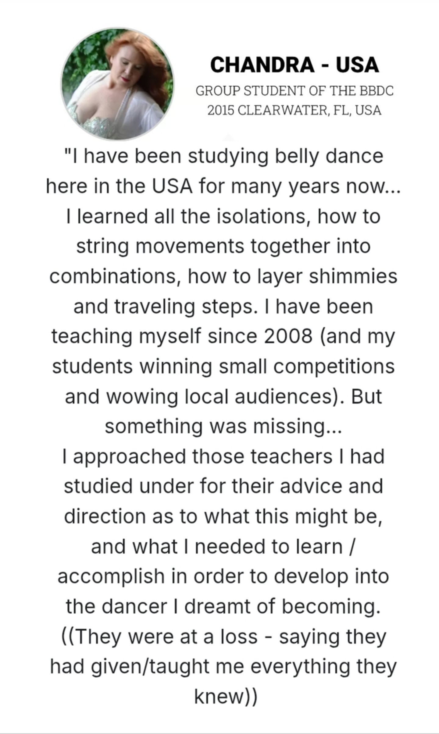 At that moment, she extended to the BBDC the movements of golden era, and also focus in the style of the Golden Era, renaming the BBDC as BGBDC Become a Golden BellyDancer Course, for this it had to be added some extra days, so instead of an intensive 20 days, had to be 24 days.